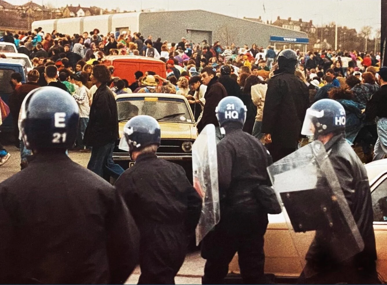 Jamie Holman's large-scale images use police surveillance stills from the 1980s of crowds gathered on football terraces and swarming outside illegal warehouse parties. Blown up and distorted, the works document not just the passion, intensity and fashion of rave-era football culture, but the pervasive influence of the surveillance state.